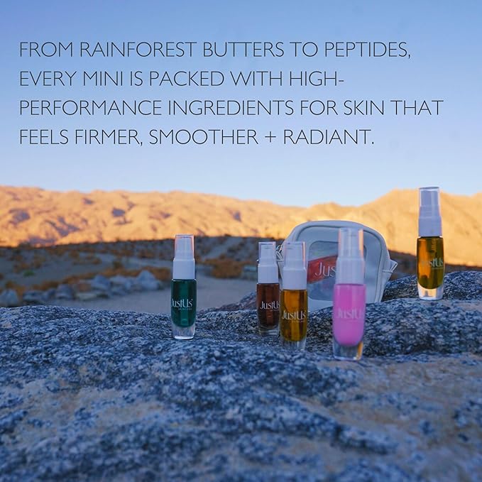JustUs Skincare Mini Kit – 5 Piece Anti-Aging Travel Set for Hydration, Firmness, Brightening + Glow — Includes Free Travel Case | $115 Value