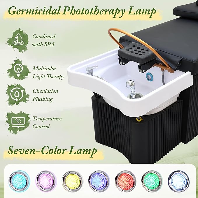 - LED Light Therapy :This Shampoo Massage Bed can provide your head with multi-color light therapy while you wash and massage your hair. The blue light, purple light, green light, and cyan light can improve your scalp and your hair, regulate your hair and scalp, improve your hair quality, and relax your brain